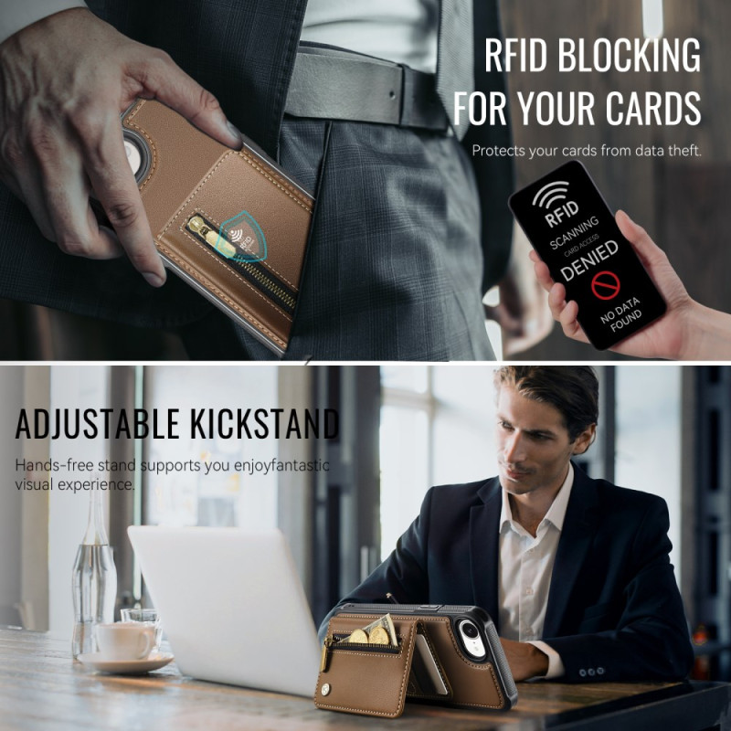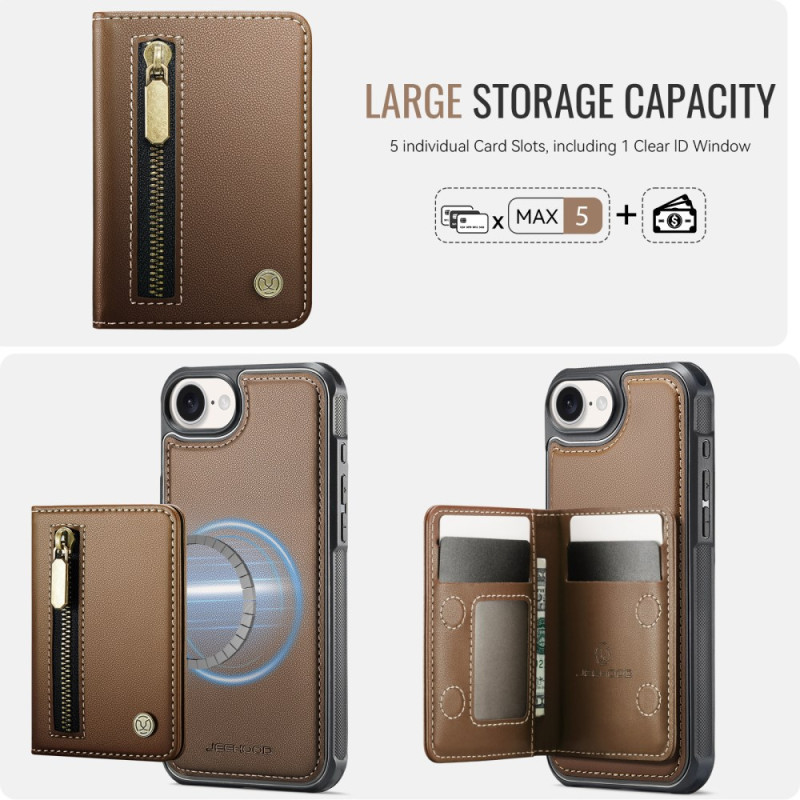 Découvrez l'étui JEEHOOD J12 pour iPhone 17E / 16E : un portefeuille magnétique détachable avec fermeture zippée, support ajustable et compatibilité MagSafe. Organisez vos cartes, argent et photos tout en protégeant votre téléphone avec style.
