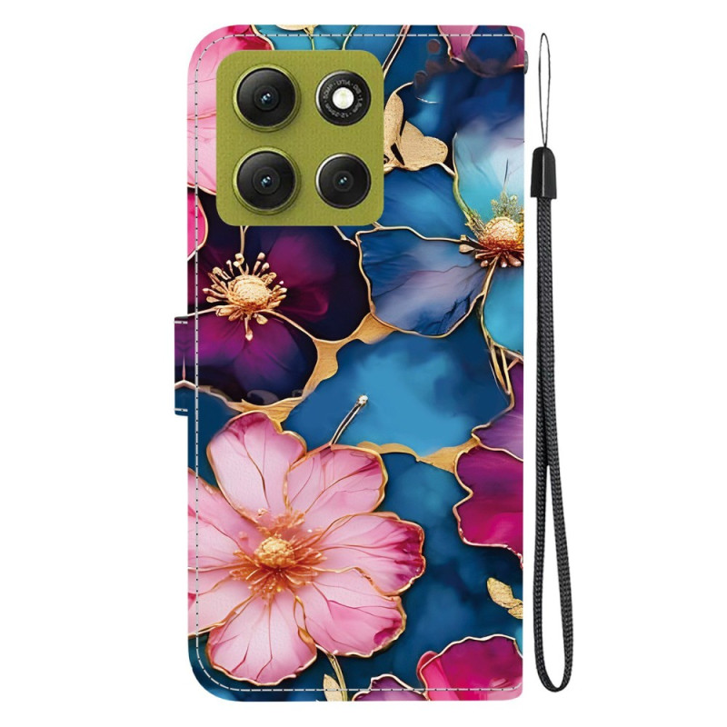 Découvrez notre étui portefeuille sophistiqué pour Motorola Moto G86 5G. Alliant style et fonctionnalité, cet accessoire en cuir PU de haute qualité offre une protection complète avec son design pratique incluant un support pliable, des fentes pour cartes et une dragonne assortie. Son motif floral bleu et or ajoute une touche d'élégance à votre appareil.