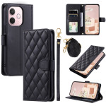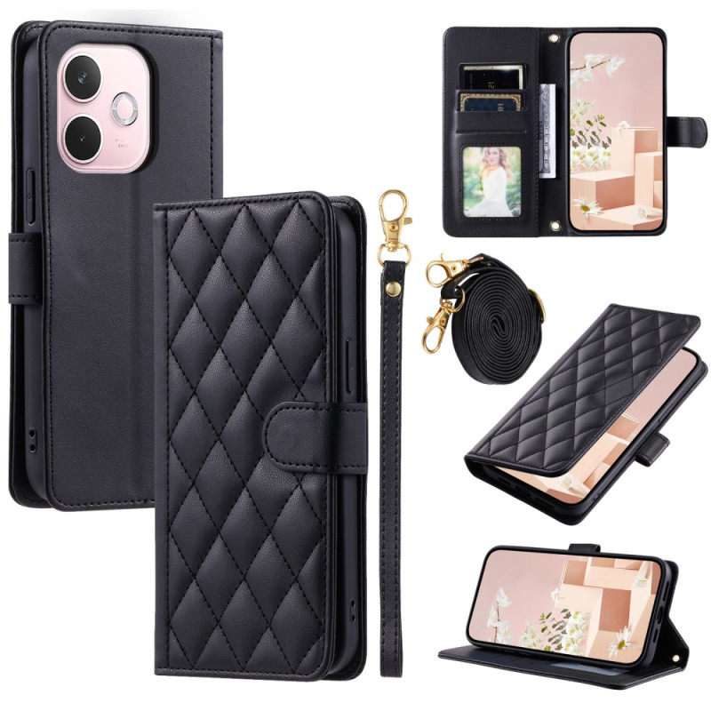 Étui portefeuille élégant avec motif matelassé en losange pour Oppo A5 Pro 5G / 4G. Doté de poches pour cartes, d'une fermeture magnétique sécurisée et d'une fonction support. Livré avec bandoulière réglable et dragonne pour un transport pratique.