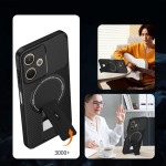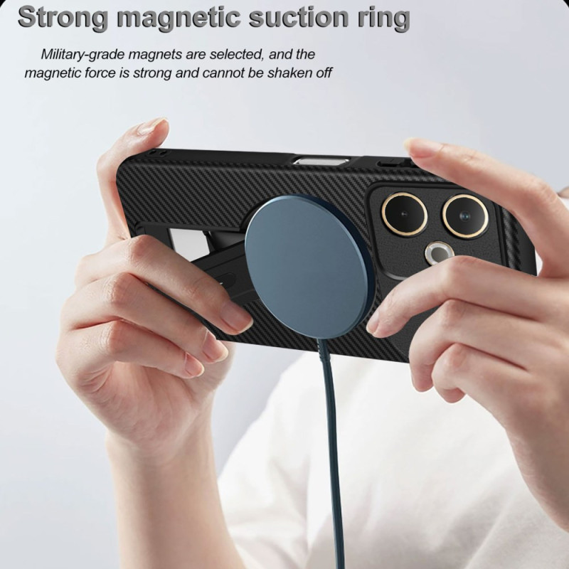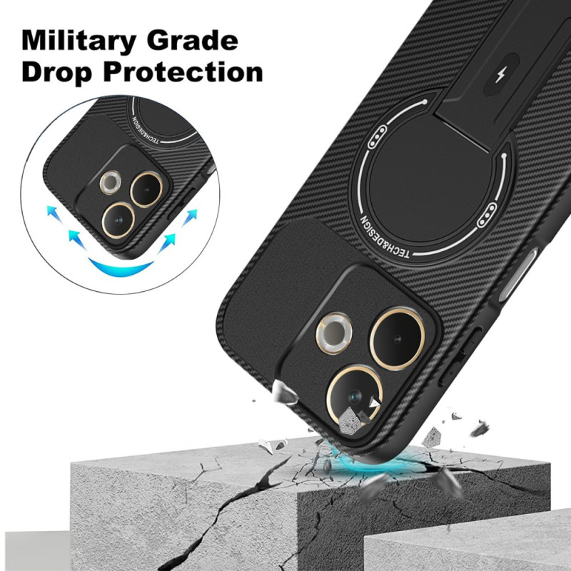 Protection hybride militaire en TPU + PC avec texture fibre de carbone. Support intégré rétractable pour visionnage mains libres. Compatible support magnétique voiture. Protection surélevée écran et caméra. Revêtement anti-traces.