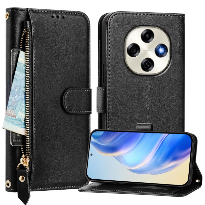 Étui multifonction en cuir PU avec poche zippée frontale, multiples emplacements pour cartes et compartiment à billets. Support mains libres intégré et fermeture magnétique sécurisée. Livré avec dragonne pour un transport pratique et sûr.