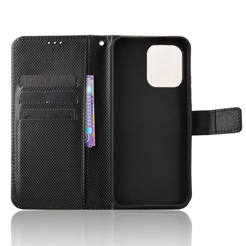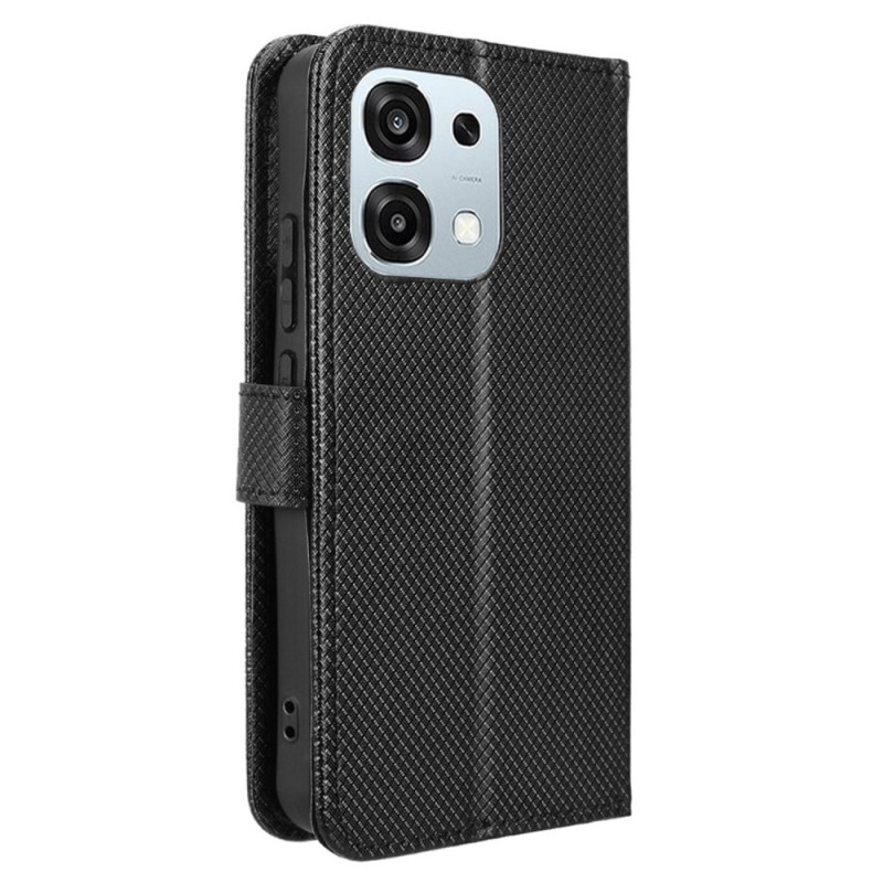 Étui portefeuille élégant avec texture diamant pour votre Oppo A6 Pro 5G. Doté de fentes pour cartes, d'un support pliable et d'une dragonne pratique. Protection intégrale contre les chocs et rayures. Fermoir magnétique sécurisé pour un usage quotidien optimal.