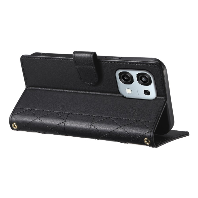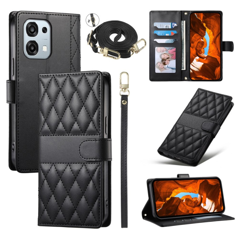 Étui portefeuille sophistiqué en cuir PU avec design matelassé losange. Comprend 3 emplacements pour cartes, 1 poche pour espèces, fonction support intégrée et fermeture magnétique sécurisée. Livré avec dragonne et bandoulière ajustable détachables pour un maximum de praticité au quotidien.