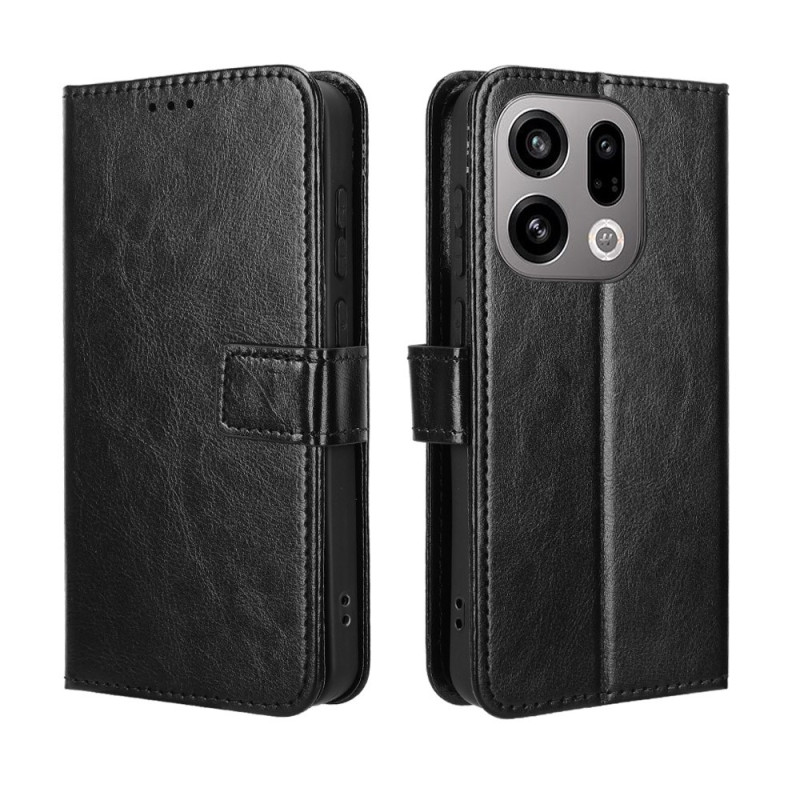 Étui portefeuille élégant en cuir PU texture cheval fou pour Oppo Find X9 5G. Doté de 3 emplacements pour cartes, d'un compartiment à billets et d'une dragonne pratique. Fermeture magnétique sécurisée et fonction support mains libres pour un confort optimal au quotidien.