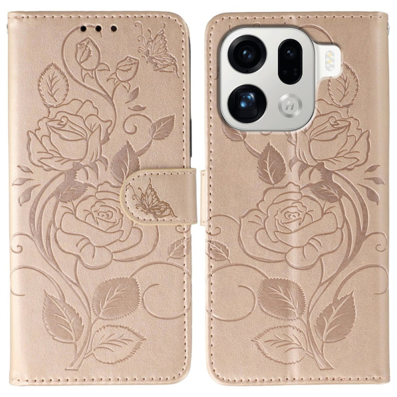 Élégant étui portefeuille en cuir PU avec un magnifique motif papillon et rose imprimé. Doté de 3 emplacements pour cartes, d'un compartiment latéral et d'une fonction support pratique pour une utilisation mains libres de votre Oppo Find X9 Pro 5G.