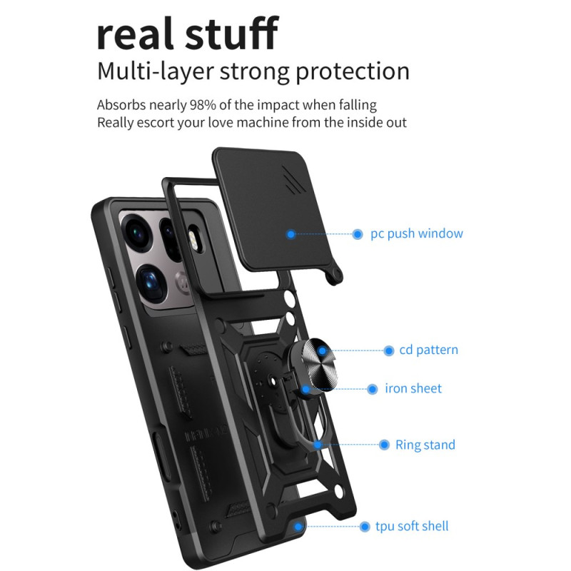 Protégez votre Oppo Find X9 Pro 5G avec cette coque robuste dotée d'une protection caméra coulissante, d'un support rotatif intégré et d'une compatibilité magnétique. Conception anti-chocs de qualité militaire pour une sécurité maximale au quotidien.