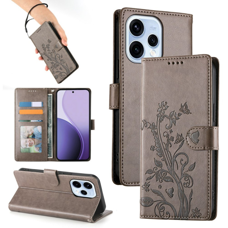 Étui portefeuille élégant pour Oppo Reno 15 5G avec motif papillon floral embossé. Conception double matière en cuir synthétique et TPU souple pour une protection optimale. Comprend un support pliable, des emplacements pour cartes et une dragonne pratique.