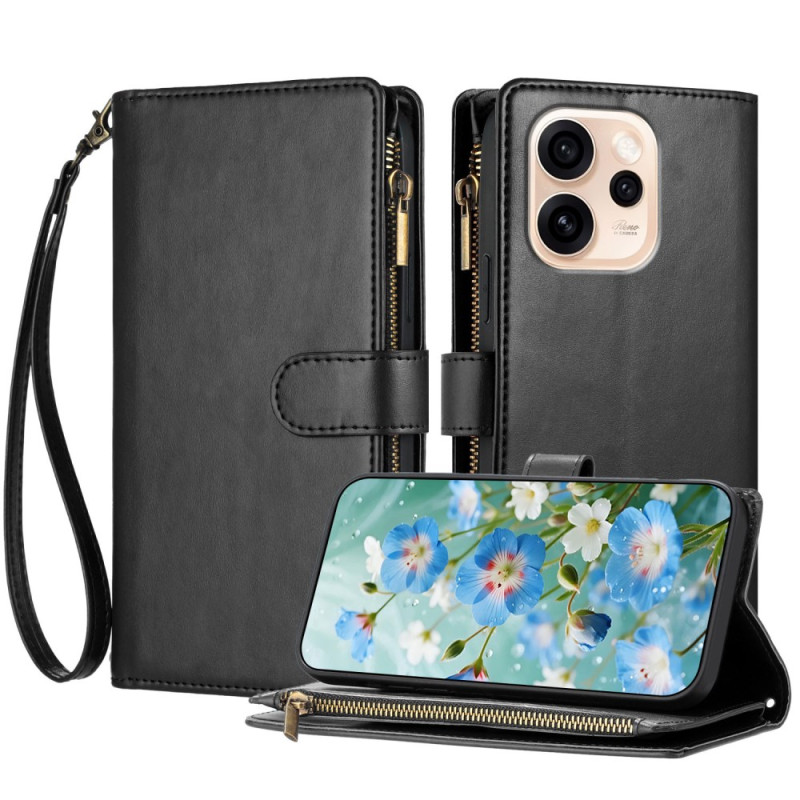 Étui portefeuille multifonction en cuir PU pour Oppo Reno 15 5G. Design élégant avec 8 emplacements pour cartes, poche zippée et support intégré. Protection antichoc renforcée avec fermeture magnétique sécurisée et dragonne amovible pour un transport facile.