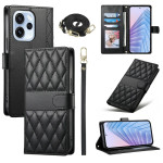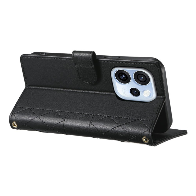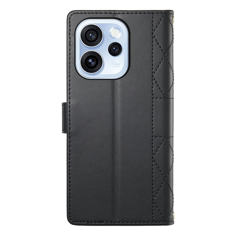 Étui portefeuille élégant en cuir PU avec design matelassé losange pour Oppo Reno 15 F 5G. Comprend 3 emplacements pour cartes, 1 poche pour espèces, fonction support intégrée et bandoulières détachables pour poignet et épaule réglable (70-150cm).