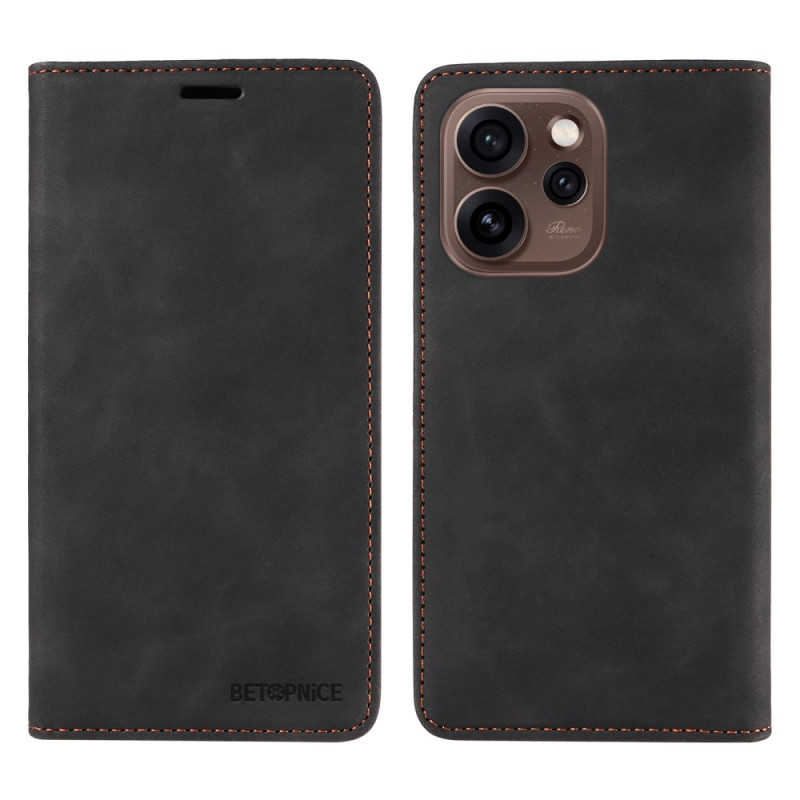Étui portefeuille en cuir pour Oppo Reno 15 Pro 5G avec fermeture magnétique sécurisée et technologie de blocage RFID. Comprend 2 fentes pour cartes, 1 poche pour espèces et un support réglable pour une visualisation mains libres optimale.