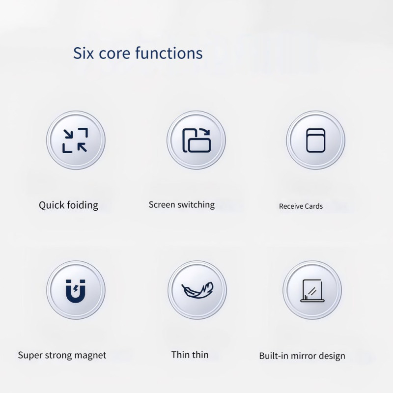 Découvrez ce support magnétique pliable pour téléphone, alliant fonctionnalité et style. Équipé d'un miroir HD et d'un porte-cartes pratique, il offre un support stable pour votre appareil.