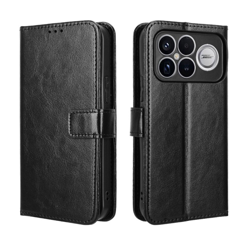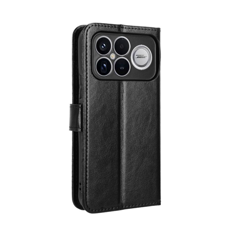 Étui portefeuille élégant en cuir PU texture cheval fou pour votre Poco F8 Ultra. Comprend 3 emplacements pour cartes, 1 compartiment à billets, fonction support mains libres et dragonne pratique. Protection intégrale contre les chocs quotidiens.