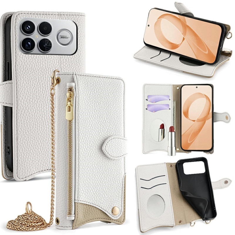 Étui portefeuille élégant avec design queue de poisson irrégulier pour Poco F8 Ultra. Doté de 2 emplacements pour cartes, miroir de maquillage, poche zippée et bandoulière chaîne amovible de 1,2m.