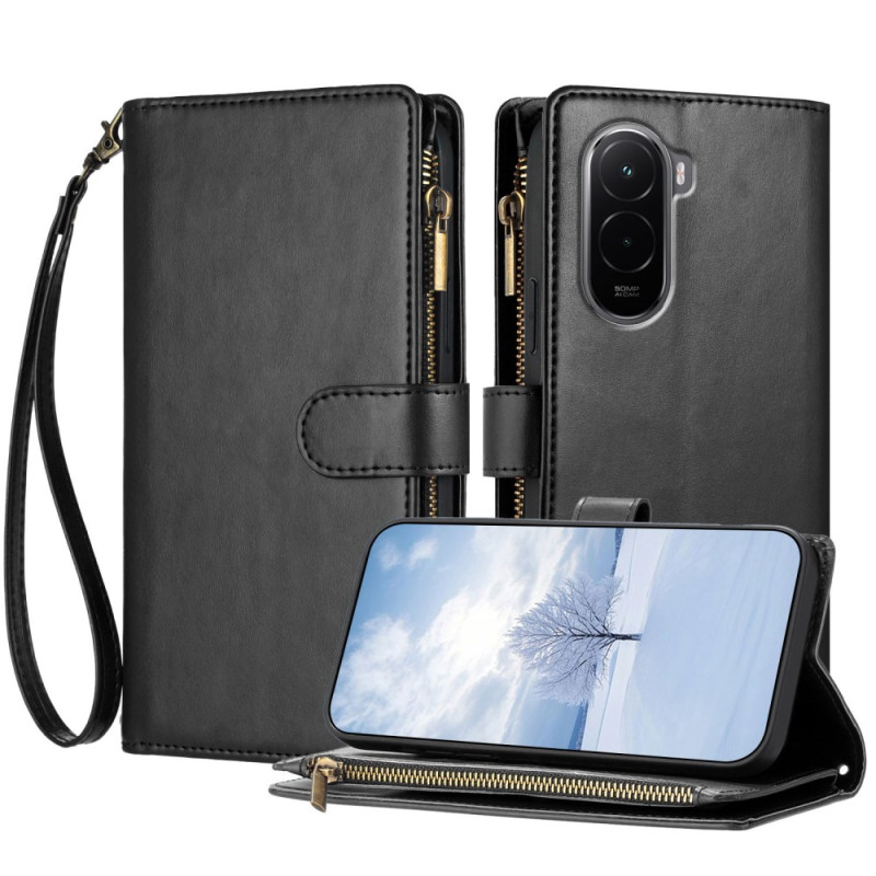 Étui portefeuille multifonction en cuir PU pour Xiaomi Poco M7 4G. Design élégant avec 8 emplacements pour cartes, poche zippée, support mains libres et dragonne amovible. Protection antichoc optimale pour votre smartphone au quotidien.