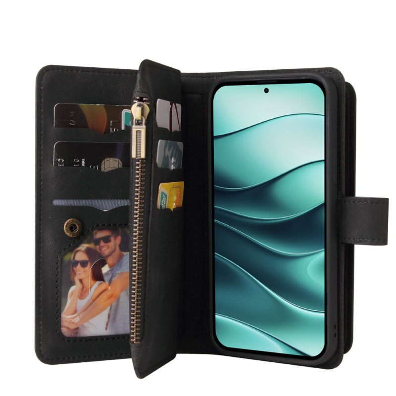 Découvrez l'étui portefeuille multifonction pour Xiaomi Redmi Note 14 5G / Poco M7 Pro 5G. Avec 15 emplacements pour cartes, une poche zippée sécurisée et une dragonne détachable, cet étui combine style et praticité pour protéger votre téléphone au quotidien.