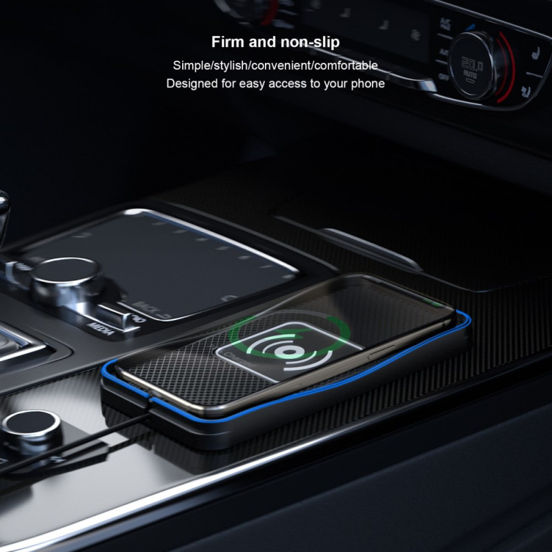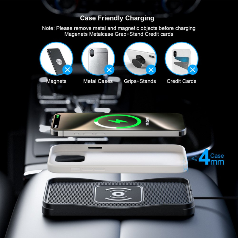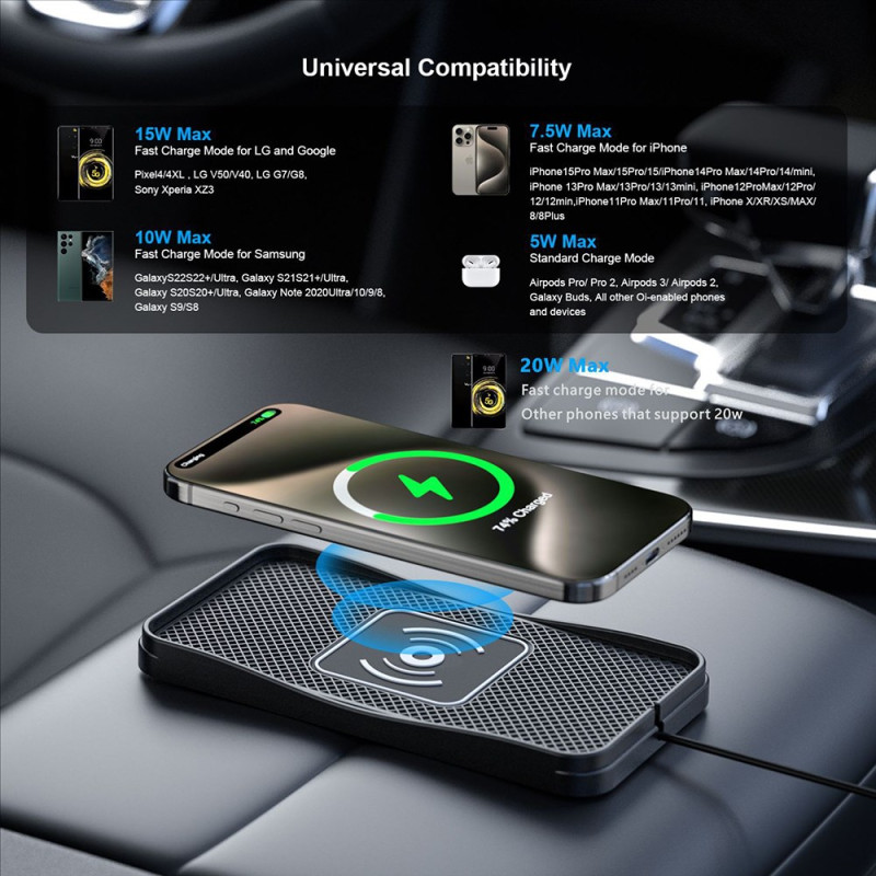 Chargeur sans fil pour voiture offrant une recharge rapide jusqu'à 20W. Doté d'un pad antidérapant en silicone pour maintenir votre téléphone en toute sécurité pendant la conduite. Installation facile sans modification du véhicule, avec câble de 1 mètre.