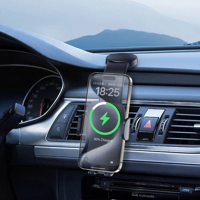 • Serrage Automatique Intelligent : Approchez simplement votre téléphone du support et les bras se referment automatiquement pour maintenir fermement votre appareil tout en démarrant la charge instantanément