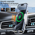 Chargez votre téléphone en toute simplicité avec ce support de voiture innovant. Doté d'un chargeur sans fil rapide 15W, d'une rotation 360° et d'une lumière d'ambiance LED, il allie performance et style pour vos trajets quotidiens.