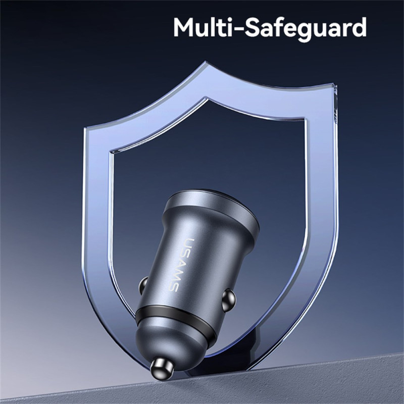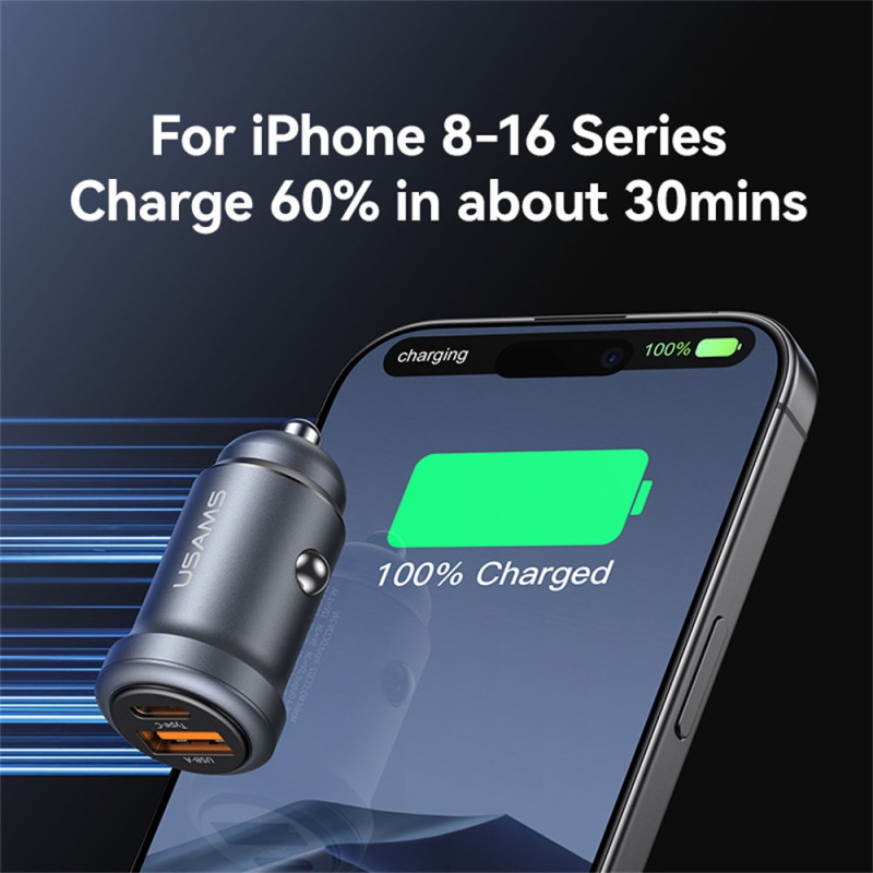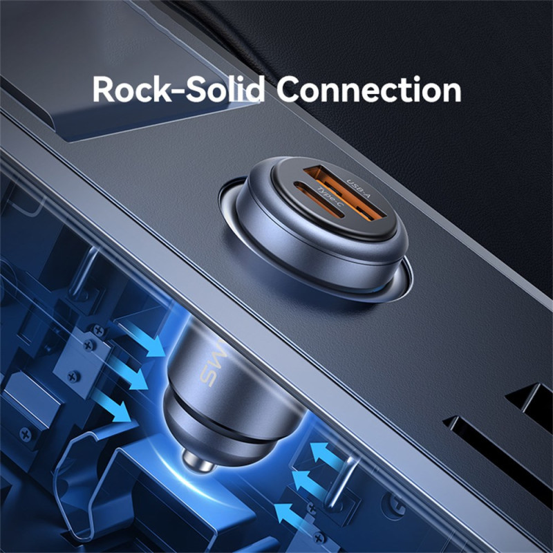 Chargeur voiture ultra-compact 30W avec double port USB-A et USB-C pour une charge rapide et polyvalente. Son design miniature et sa construction robuste garantissent une dissipation thermique optimale. Compatible avec tous vos appareils numériques.