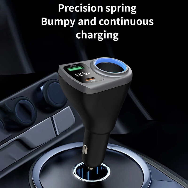 Chargeur allume-cigare intelligent 3-en-1 avec affichage digital de tension en temps réel. Offre une charge rapide PD 30W via port Type-C, port USB QC 3.0 18W et prise allume-cigare pour charger simultanément plusieurs appareils.