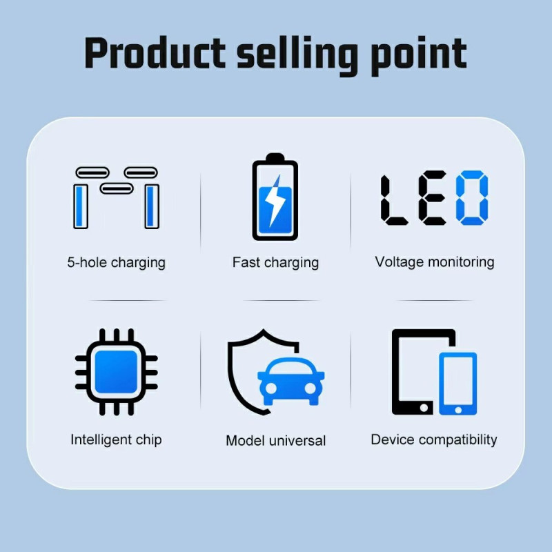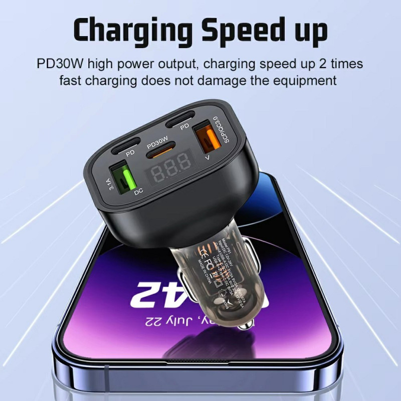 Chargeur voiture haute performance 150W avec 5 ports (3 Type-C + 2 USB) et technologie de charge rapide QC3.0 PD. Doté d'une puce intelligente à double cœur et d'un affichage de tension en temps réel pour une charge optimale de tous vos appareils.