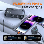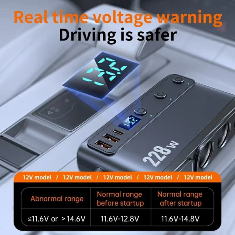 Chargeur voiture multifonction 9 en 1 de 228W avec prises allume-cigare, ports PD et USB. Écran digital affichant la tension de la batterie pour une conduite sécurisée. Clips anti-dérapants pour un maintien stable. Compatible avec les protocoles de charge rapide Apple PD, QC3.0, Samsung AFC et Huawei FCP...