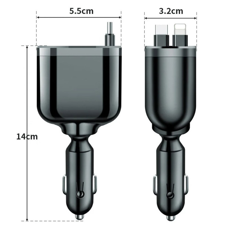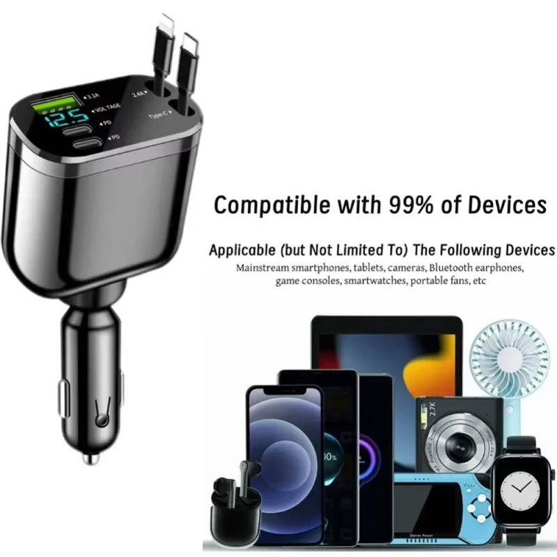 Chargeur voiture ultra-performant 5-en-1 avec affichage numérique intelligent. Rechargez simultanément jusqu'à 5 appareils grâce à ses ports USB et Type-C à charge rapide. Câbles rétractables intégrés pour iPhone et appareils Type-C.