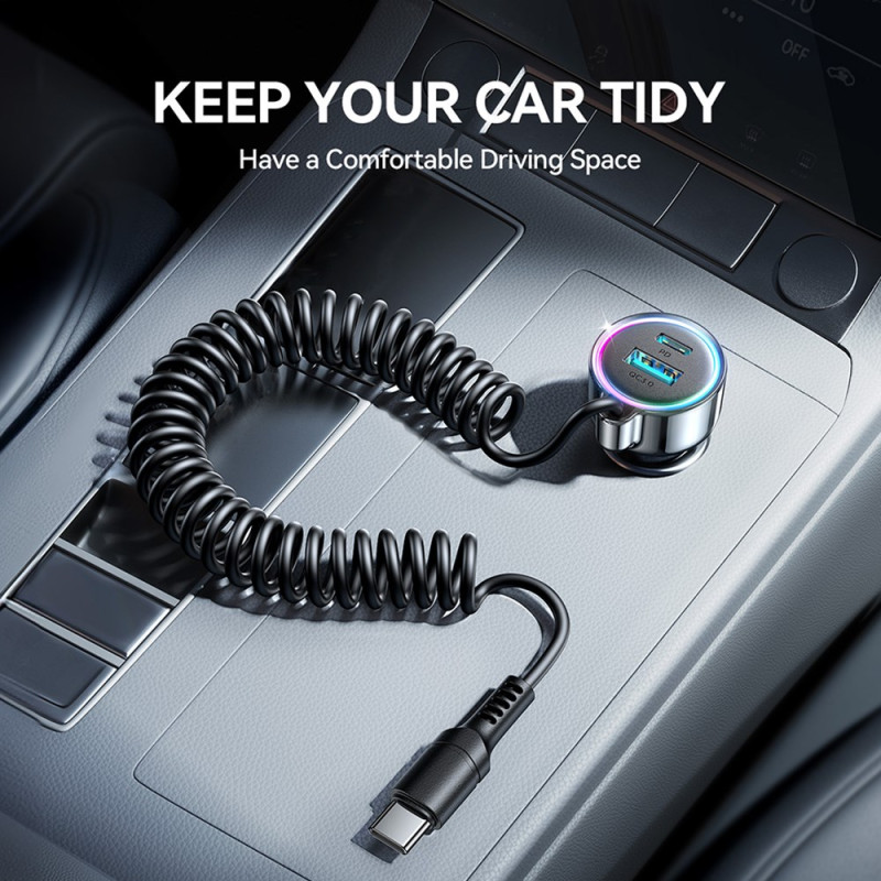 Rechargez jusqu'à trois appareils simultanément avec notre chargeur de voiture ultra-rapide 72W. Doté d'un câble ressort extensible jusqu'à 1,6m et d'un éclairage ambiant 7 couleurs, il offre une charge sécurisée et pratique pour tous vos appareils.