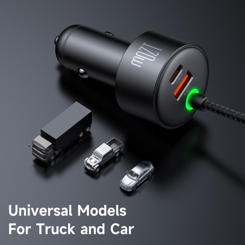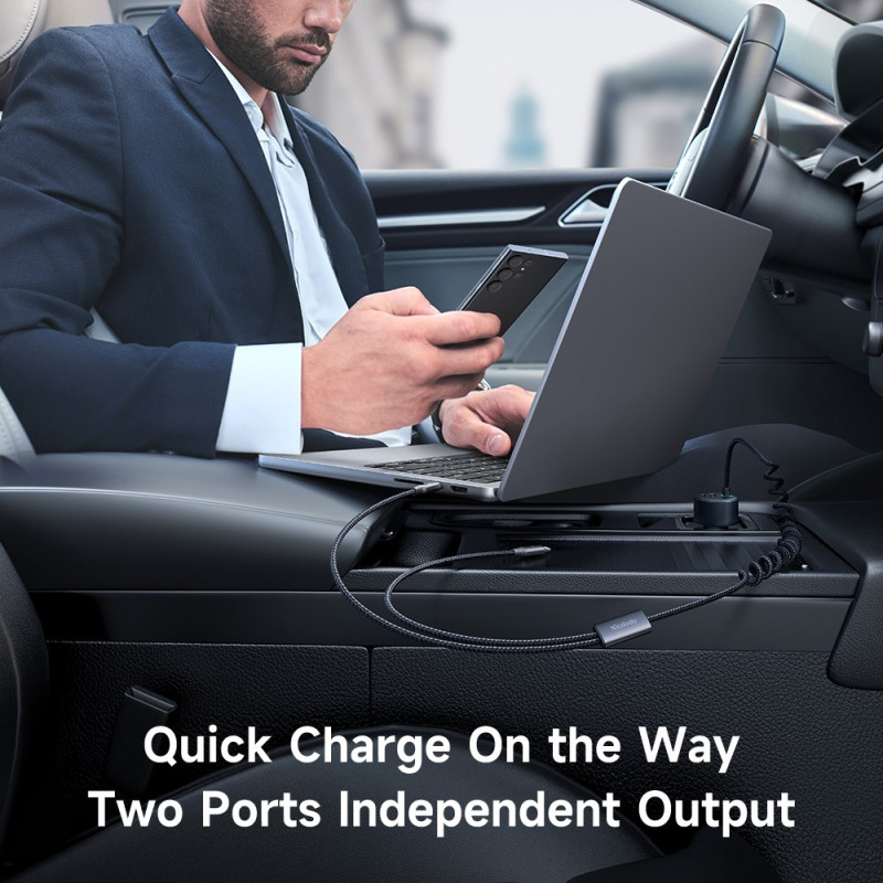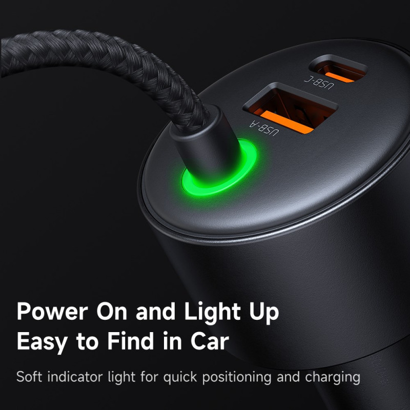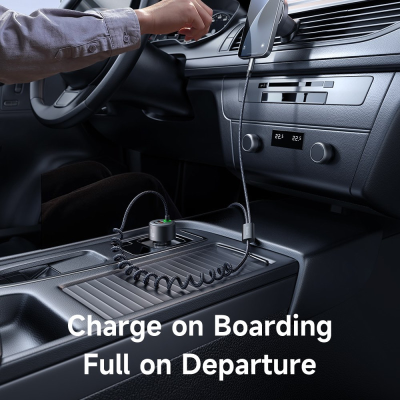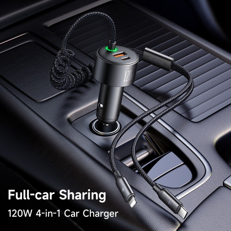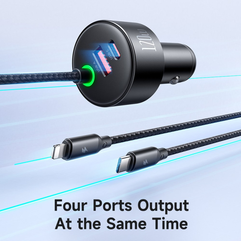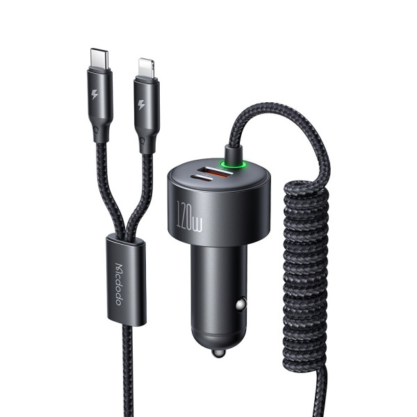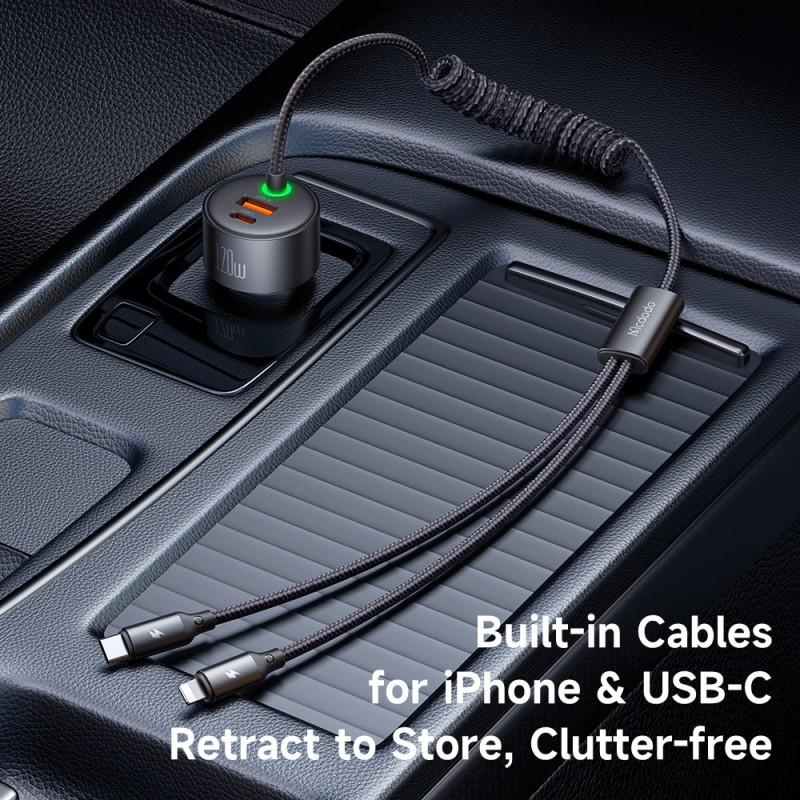 Chargez tous vos appareils simultanément avec ce chargeur voiture haute performance 120W. Doté de ports USB-C et USB-A offrant respectivement 60W et 30W, il intègre des câbles USB-C et Lightning rétractables pour une utilisation sans encombrement.