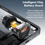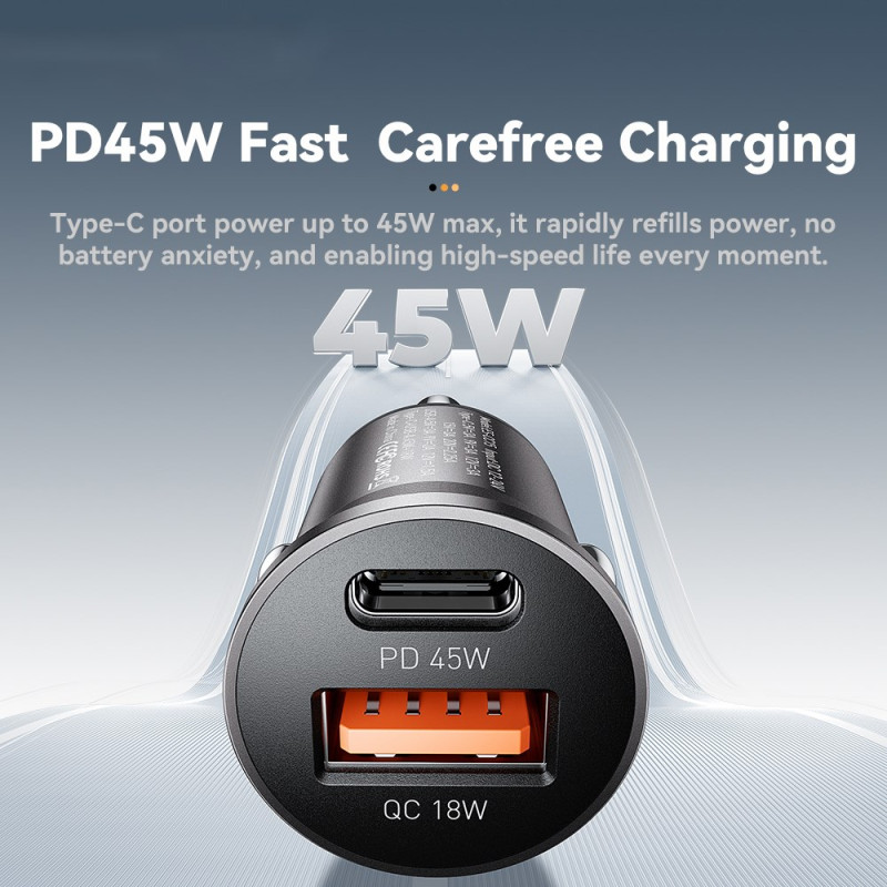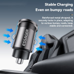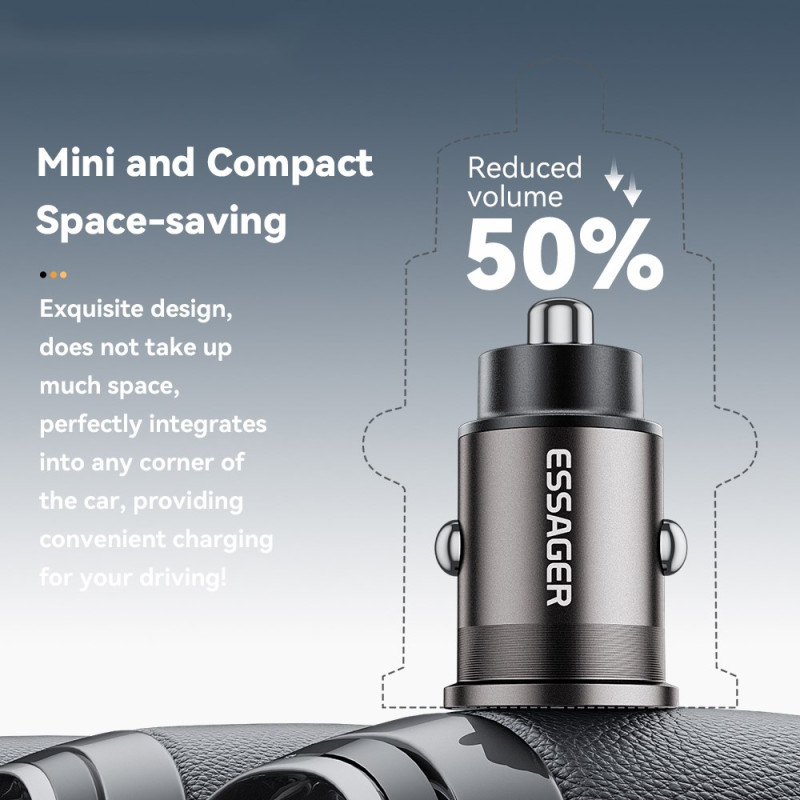 Chargeur voiture ESSAGER 45W avec technologie de charge rapide PD et QC. Double port USB-A et Type-C pour charger simultanément deux appareils. Design ultra-compact (10g) avec puce intelligente pour une charge optimale et sécurisée. Compatible avec tous les véhicules 12-24V.