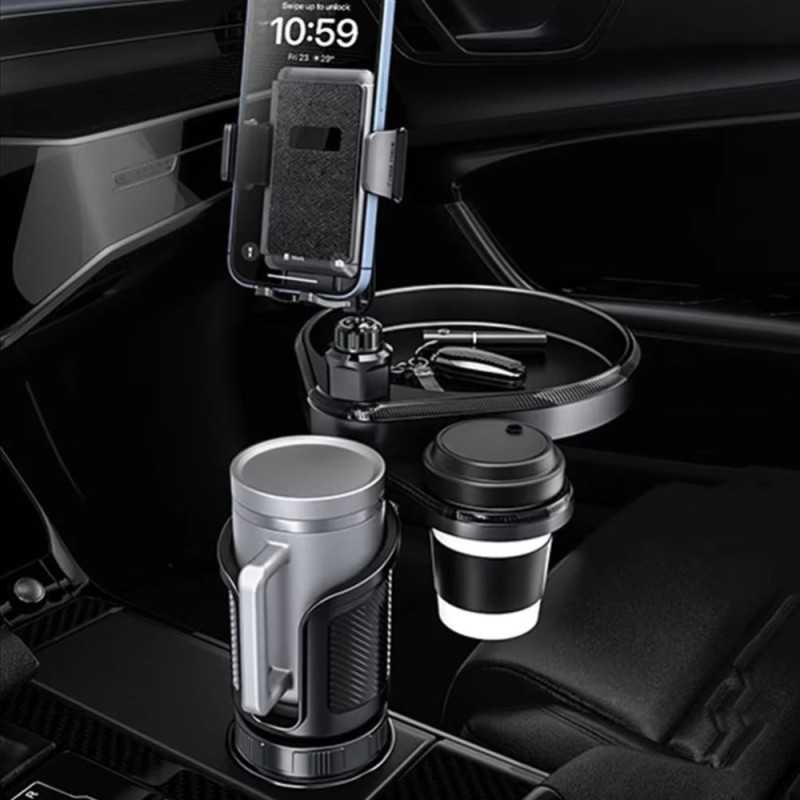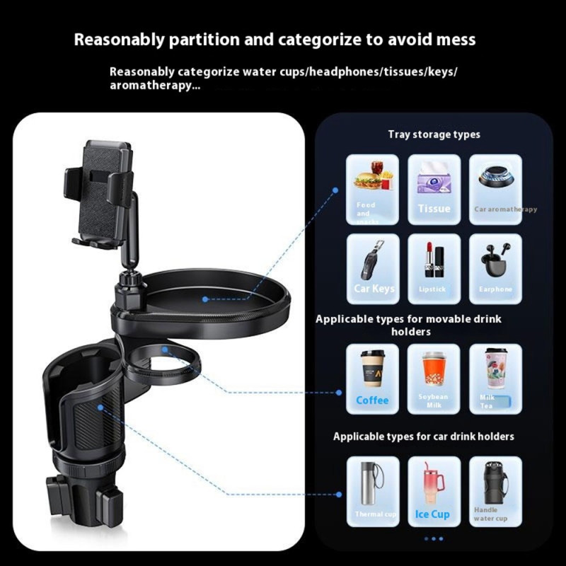 Transformez votre porte-gobelet en station multifonction ! Ce support universel 4-en-1 combine support téléphone rotatif 360°, plateau de rangement et doubles porte-gobelets. Installation facile par simple rotation, compatible avec la plupart des véhicules.