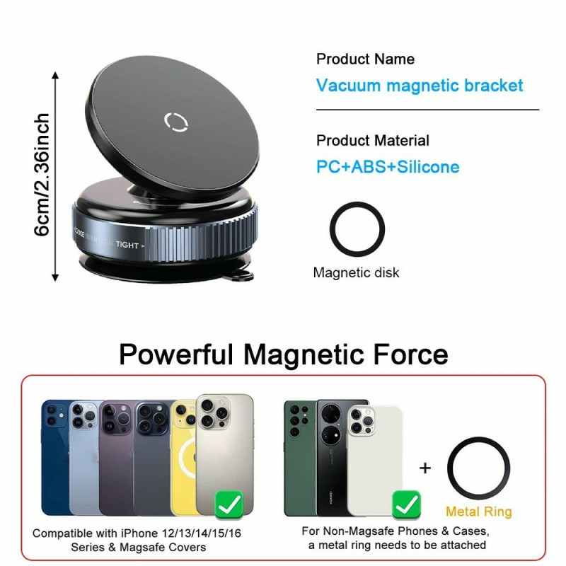Support magnétique universel avec ventouse à vide et rotation 360° pour une navigation optimale. Aimants puissants N52 pour une fixation sécurisée sur toutes les surfaces planes. Compatible avec tous les smartphones.