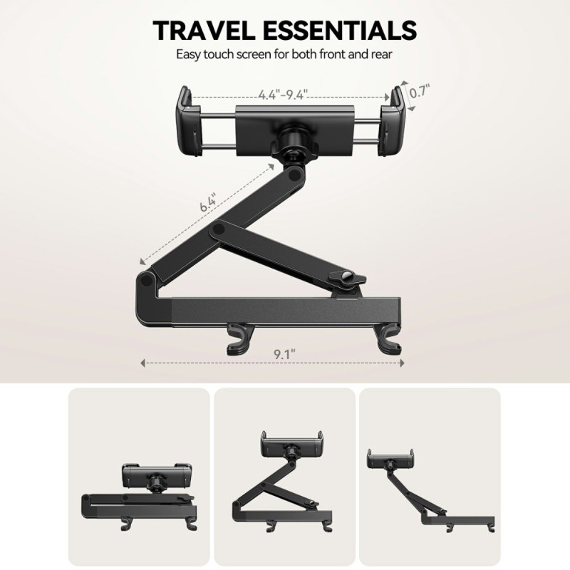 Support tablette innovant pour appui-tête avec structure double axe extensible offrant une stabilité exceptionnelle. Design ajustable et pliable avec système de verrouillage sécurisé. Installation rapide grâce à la double structure à ressort. Ajustement multi-angles pour un confort optimal de visionnage. Compatible avec appareils de 4,7 à 13 pouces et espacement d'appui-tête de 70 à 158mm.