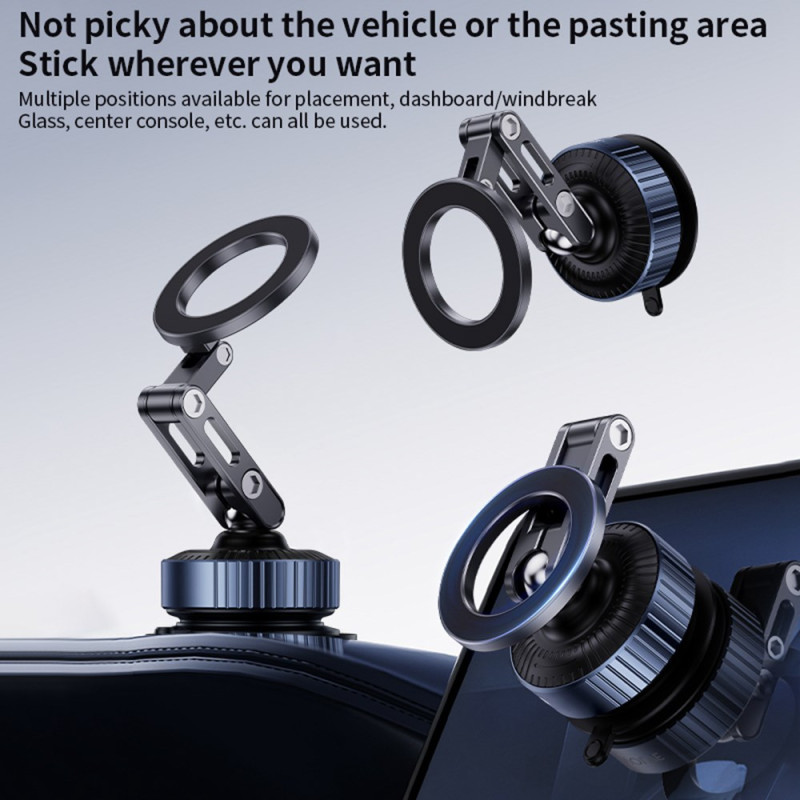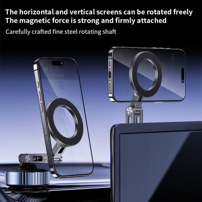 Support magnétique innovant pour voiture avec technologie de ventouse sous vide. Rotation 360° pour un angle de vue optimal. Compatible avec tous les smartphones de plus de 4,7 pouces. Installation facile sur tableau de bord.