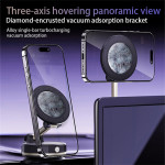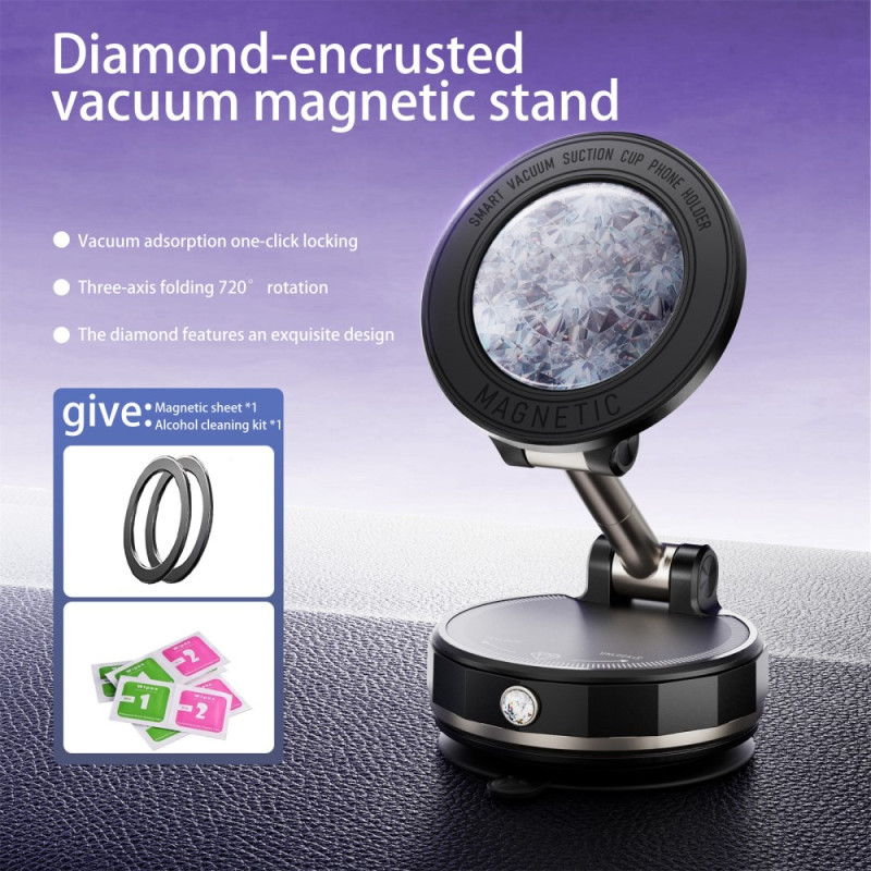 Support téléphone voiture magnétique pliable avec design élégant en résine époxy et strass. Équipé de 17 aimants N52 ultra-puissants pour une fixation sécurisée pendant la conduite. Ventouse à vide pour installation sur tableau de bord ou pare-brise.