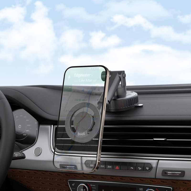 La maîtrise totale de l'angle de vue et la sécurité du dispositif sont des facteurs essentiels pour une conduite sans distraction. Ce support BUDI utilise un puissant aimant pour maintenir fermement le téléphone, même lors de mouvements brusques. Le dispositif intègre une double rotation (360° sur le connecteur et 240° sur le bras), permettant un ajustement complet pour répondre aux besoins de navigation ou d'appel vidéo. La base à ventouse assure une fixation polyvalente et fiable sur diverses surfaces. L'installation et le retrait du téléphone sont rapides et facilités par l'adsorption magnétique.