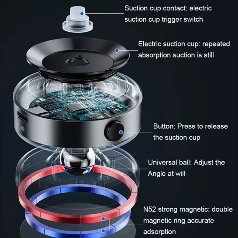 Ce support téléphone magnétique offre une fixation ultra-sécurisée grâce à son système combinant 16 aimants puissants et une double technologie d’aspiration magnétique et sous vide. Sa rotation à 360° permet d’ajuster facilement l’angle de vision pour une conduite sûre et confortable. Conçu en alliage de zinc et plastique de qualité, il allie robustesse et élégance pour s’intégrer harmonieusement à l’intérieur du véhicule. Compatible avec tous les smartphones de 4 à 6,5 pouces, il peut également se fixer sur d’autres surfaces lisses comme un bureau ou un équipement de sport.