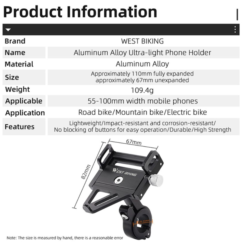 L'alliage d'aluminium usiné CNC confère à ce support de téléphone une durabilité, une légèreté et une résistance à l'oxydation inégalées. Ce dispositif WEST BIKING, pesant seulement 109.4g, est conçu pour sécuriser les téléphones de 55mm à 100mm de largeur. Le design intelligent préserve l'accès aux boutons latéraux et au port de charge. La base large et haute s'installe solidement sur des tubes ronds de 20mm à 33mm. Grâce à l'ajustement par vis de 6mm, l'angle de fixation peut être optimisé pour une stabilité et une visibilité maximales sur tous les types de vélos.