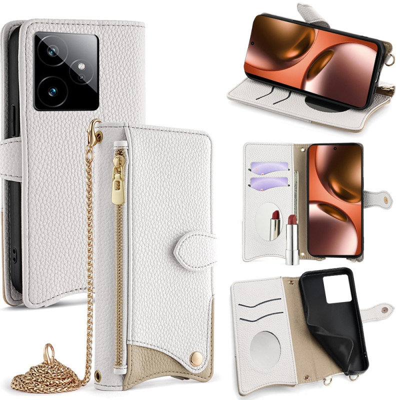 Étui portefeuille multifonctionnel pour Realme GT 7 5G avec design queue de poisson irrégulière. Comprend 2 emplacements pour cartes, miroir de maquillage, poche zippée et bandoulière chaîne de 1,2m. Protection optimale avec fermeture magnétique.