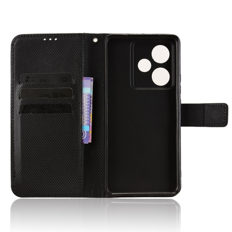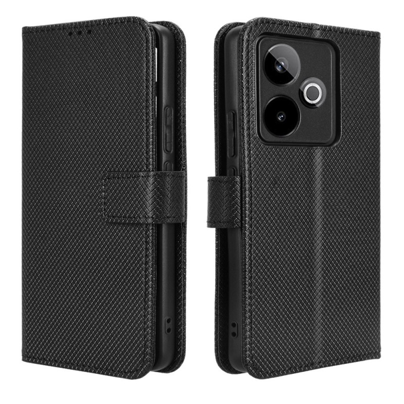 Étui portefeuille élégant avec texture diamant sophistiquée pour votre Realme GT7 5G. Doté de multiples emplacements pour cartes, d'une poche pour billets et d'une fermeture magnétique sécurisée. La dragonne pratique facilite le transport au quotidien.