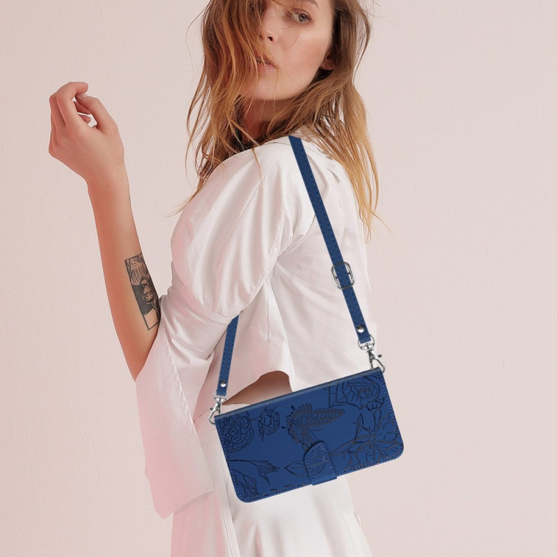 La housse en simili cuir Papillons vient avec une bandoulière ajustable pour transporter le Samsung Galaxy A13.