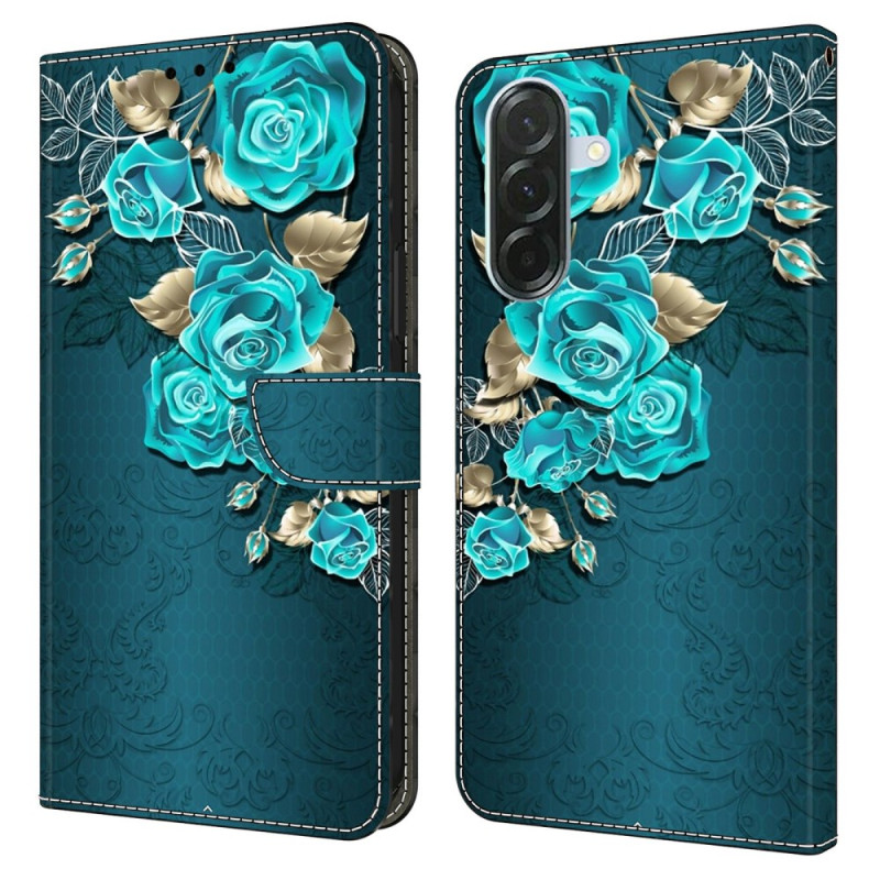 Étui portefeuille élégant pour Samsung Galaxy A37 5G avec motif rose bleue en 3D. Dispose de 2 emplacements pour cartes, 1 poche pour espèces, fonction support intégrée et fermoir magnétique sécurisé. Protection complète avec rebord surélevé pour l'objectif.