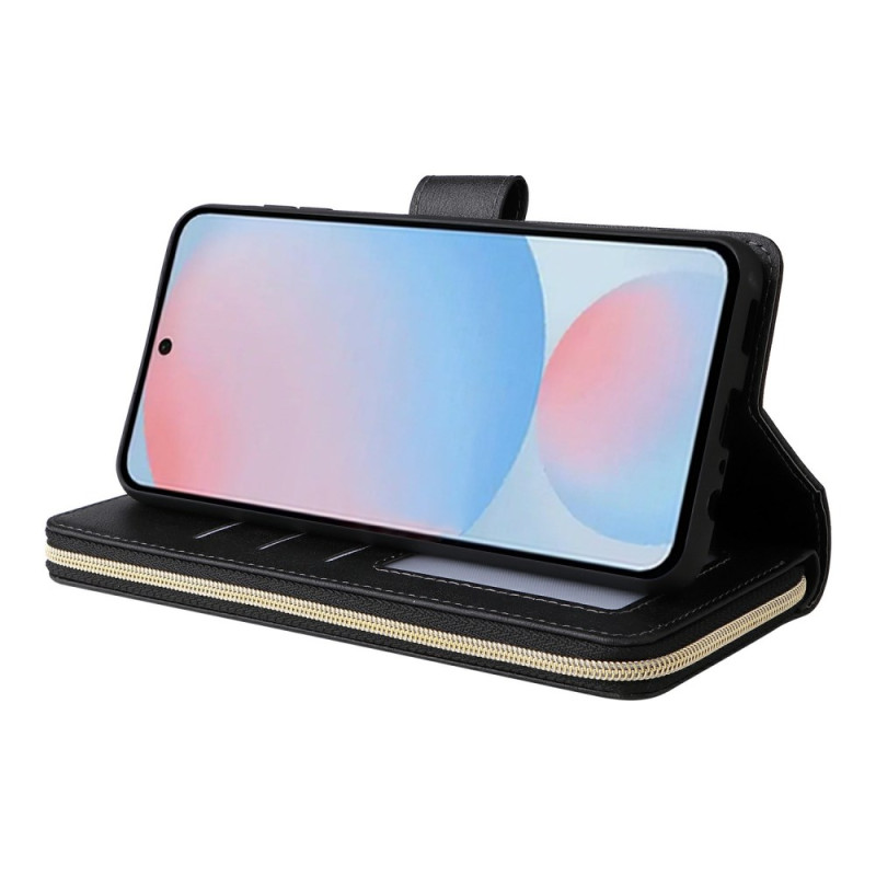 Étui multifonction en cuir PU pour Samsung Galaxy A57 5G. Dispose de 9 emplacements pour cartes, d'une poche zippée pour l'argent liquide et d'une dragonne pratique. Fermeture magnétique sécurisée et support intégré pour un usage mains libres.