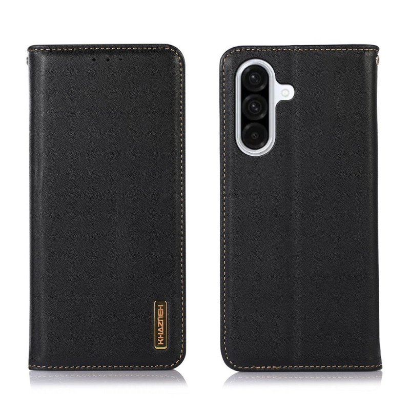 Étui portefeuille premium en cuir de vachette véritable avec texture Nappa pour Samsung Galaxy A57 5G. Combine élégance et fonctionnalité avec protection RFID, support intégré et fermeture magnétique sécurisée pour vos cartes et téléphone.
