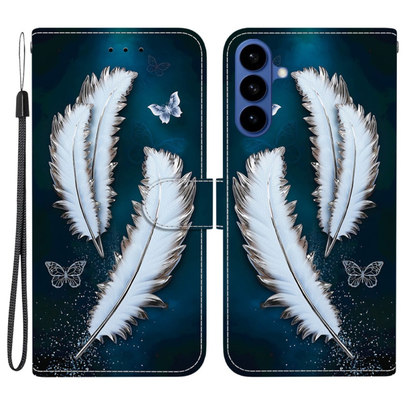 Étui portefeuille élégant pour Samsung Galaxy S26 avec motif papillon blanc et plumes. Doté de fentes pour cartes, fermeture magnétique sécurisée, fonction support et lanière détachable. Protection optimale contre les chocs et les rayures.
