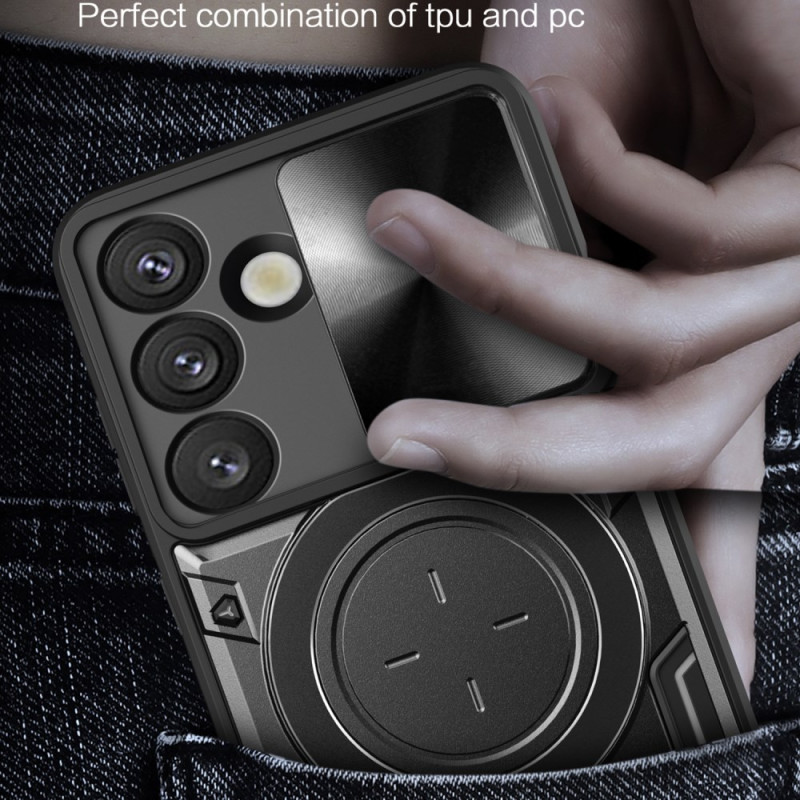Protection complète pour votre Samsung Galaxy S26 5G. Cette coque robuste combine TPU et PC pour une résistance optimale aux chocs. Béquille rotative 360°, support magnétique intégré et cache caméra coulissant pour une sécurité maximale.