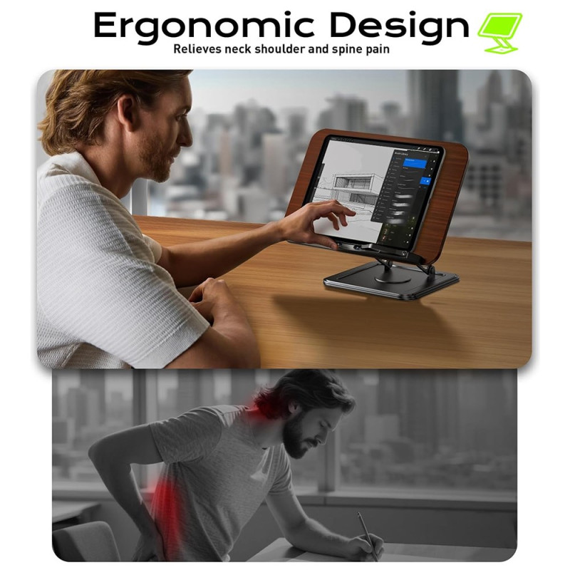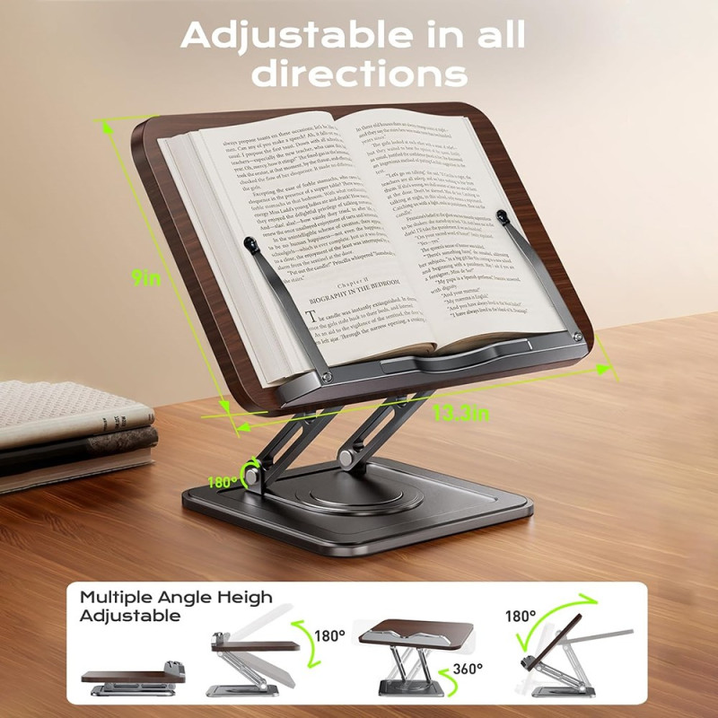De l'élégance naturelle du bois à la robustesse de l'acier carbone, ce support est la solution polyvalente pour tout espace de travail. Fabriqué en MDF et en acier au carbone, il garantit une stabilité fiable pour le travail ou l'écriture directe. L'ajustement sur sept niveaux de hauteur permet à l'utilisateur de trouver l'angle de vue idéal, corrigeant la posture et réduisant la fatigue oculaire. La capacité de rotation à 360 degrés offre une flexibilité ultime, permettant d'ajuster l'angle de vue pour les ordinateurs portables, les tablettes ou les livres.
