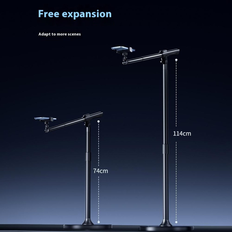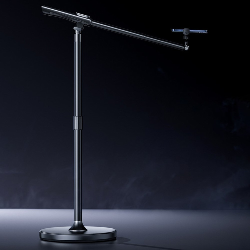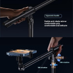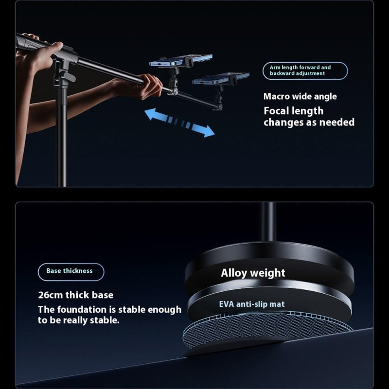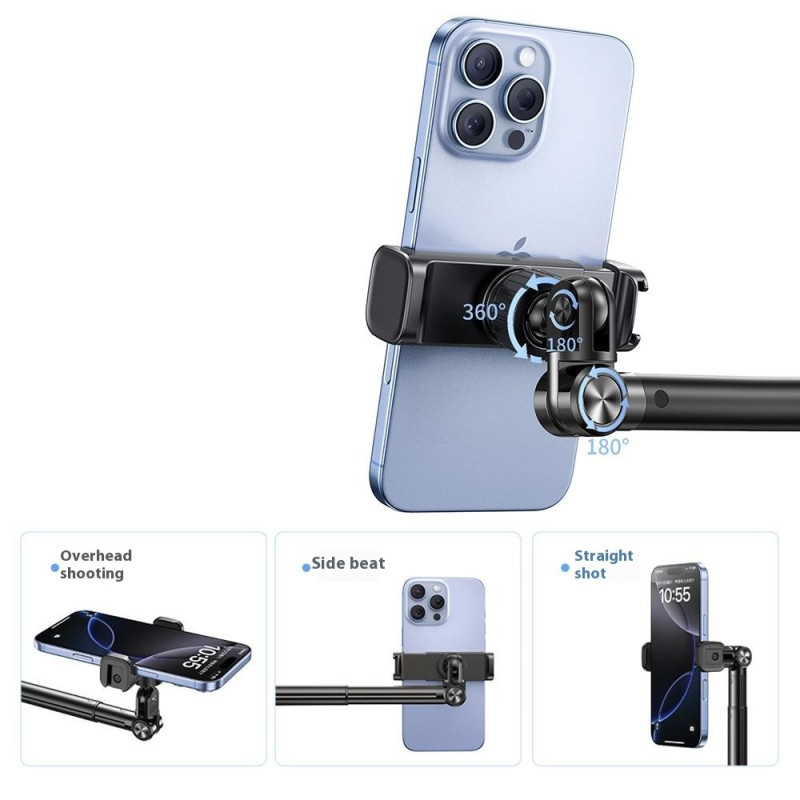 Support professionnel ajustable pour smartphone avec bras panoramique 360°, base stable de 26cm et réglages verticaux/horizontaux 180°. Parfait pour le streaming en direct, la création de contenu et les vidéos. Compatible avec smartphones jusqu'à 6,7 pouces. Interface pour accessoires incluse.