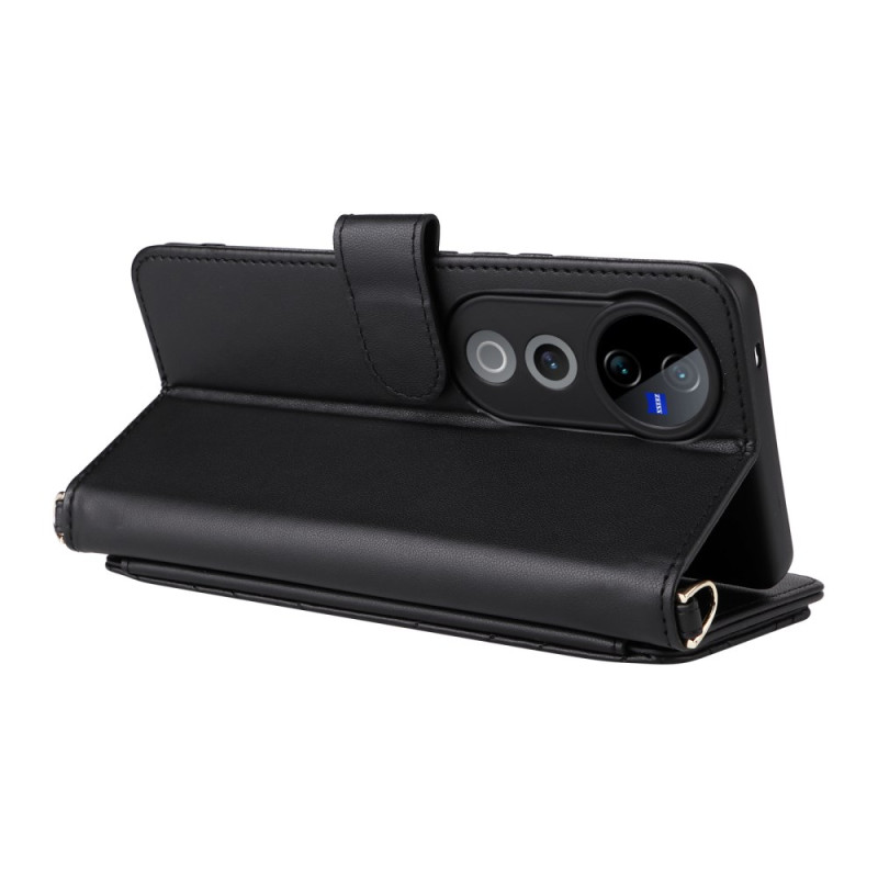Étui portefeuille multifonction en cuir PU premium pour Vivo V40 5G, offrant une protection intégrale avec support ajustable, 6 emplacements pour cartes, fermeture magnétique sécurisée et bandoulière amovible pour un transport pratique au quotidien.
