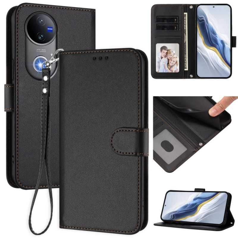 Étui portefeuille élégant et pratique pour votre Vivo V50 5G / V50e 5G. Doté de 3 emplacements pour cartes, d'un support mains-libres intégré et d'une dragonne sécurisée. Compatible avec la charge sans fil et offrant une protection complète contre les chocs quotidiens.